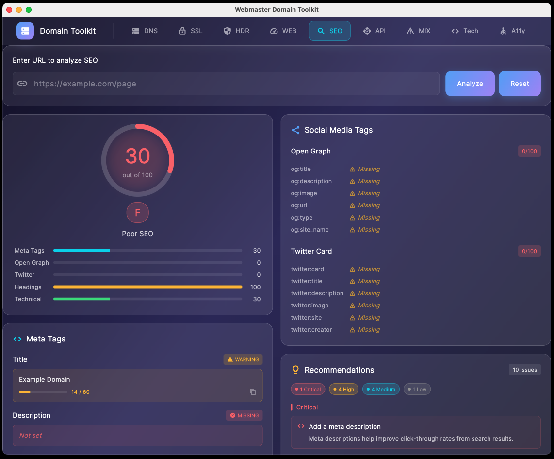 Here's a closer look at some of the specialized analyzers that make Webmaster Domain Toolkit indispensable for web professionals.
